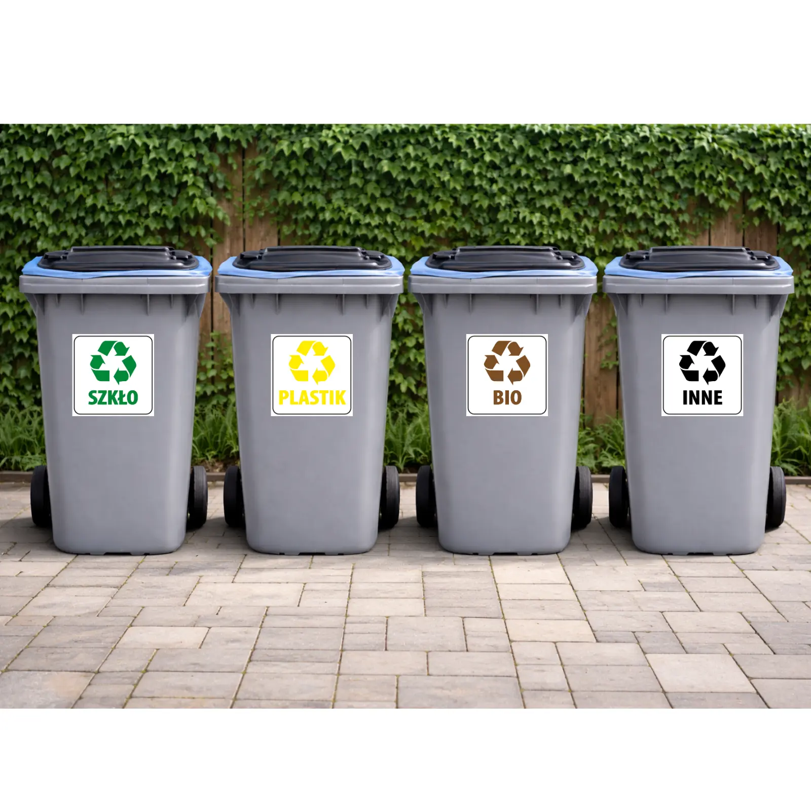 Naklejki 20×20 cm najlepiej sprawdzają się na większych koszach i pojemnikach zewnętrznych.