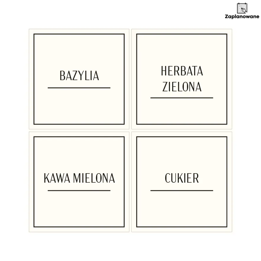 Kwadratowy format 4x4 cm to jeden z najbardziej uniwersalnych rozmiarów etykiet do organizacji kuchni. Naklejki świetnie sprawdzają się jako: