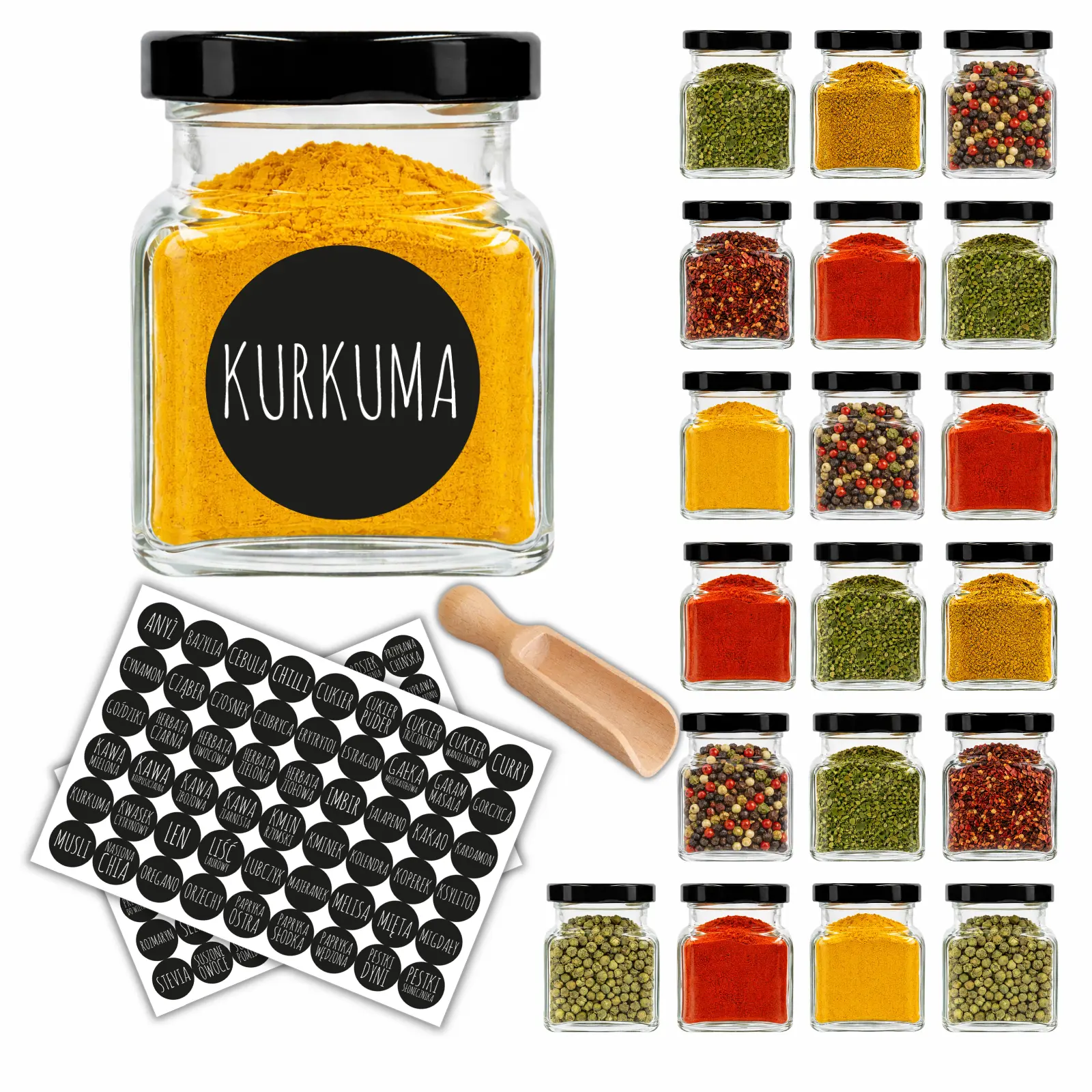 Zestaw słoiczków na przyprawy 120 ml + naklejki + czerpak – gotowy system organizacji kuchni